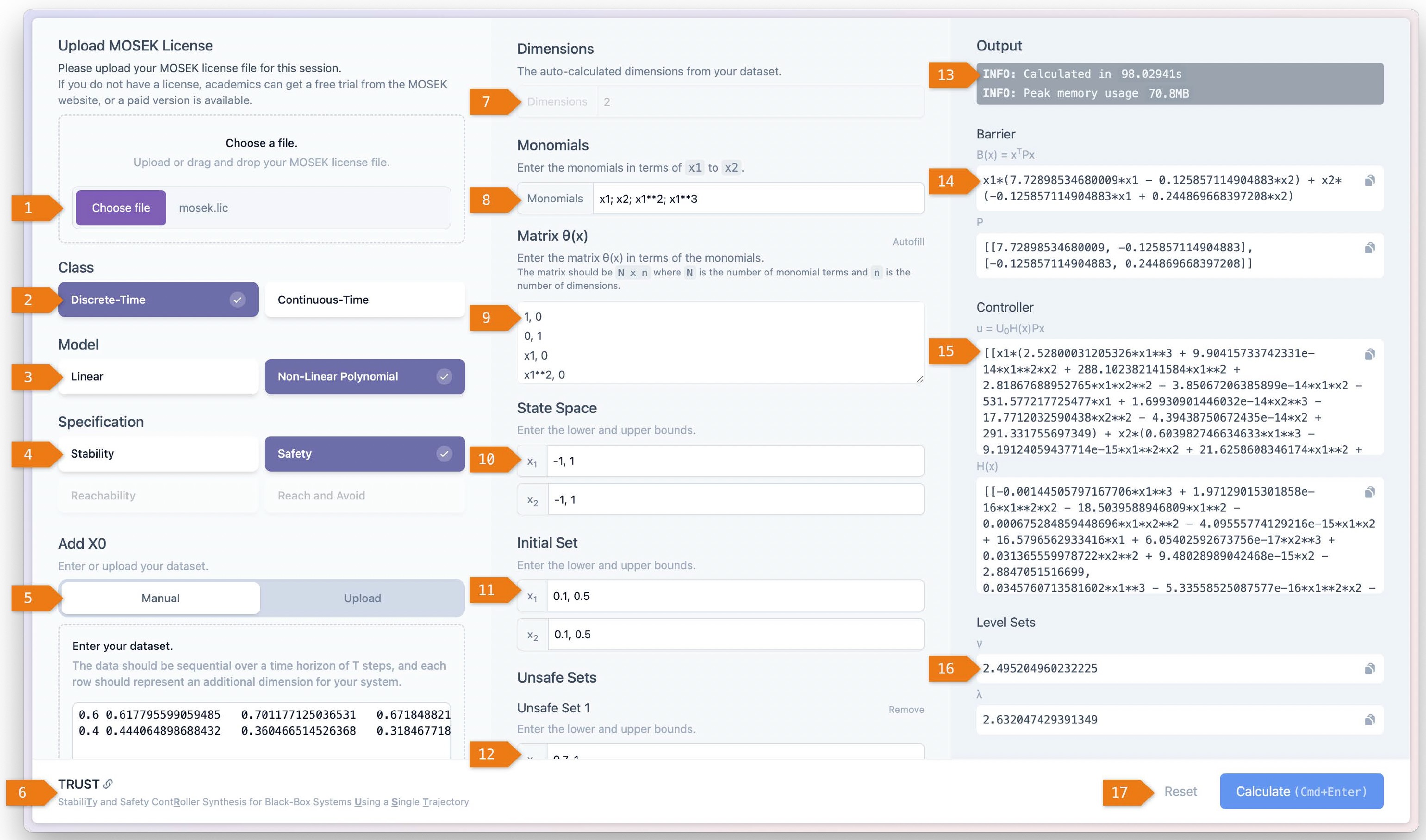 TRUST: Stability and Safety Controller Synthesis for Unknown Dynamical Models Using a Single TrajectoryTRUST is an open-source software tool developed for data-driven controller synthesis of dynamical systems with unknown mathematical models, ensuring either stability or safety properties. By collecting only a single input-state trajectory from the unknown system and satisfying a rank condition that ensures the system is persistently excited according to the Willems et al.'s fundamental lemma, TRUST aims to design either control Lyapunov functions (CLF) or control barrier certificates (CBC), along with their corresponding stability or safety controllers. The tool implements sum-of-squares (SOS) optimization programs solely based on data to enforce stability or safety properties across four system classes: (i) continuous-time nonlinear polynomial systems, (ii) continuous-time linear systems, (iii) discrete-time nonlinear polynomial systems, and (iv) discrete-time linear systems. TRUST also offers a Python-based web application featuring an intuitive, reactive graphic user interface (GUI) built with web technologies, which allows users to work with the application via the web without requiring downloads or installations. Leveraging the power of the Python backend and a JavaScript frontend, TRUST is designed to be highly user-friendly and accessible across desktop, laptop, tablet, and mobile devices. Download TRUST is an open-source tool and can be downloaded from its GitHub repository. The web application can be accessed at https://trust.tgo.dev. Tool paper